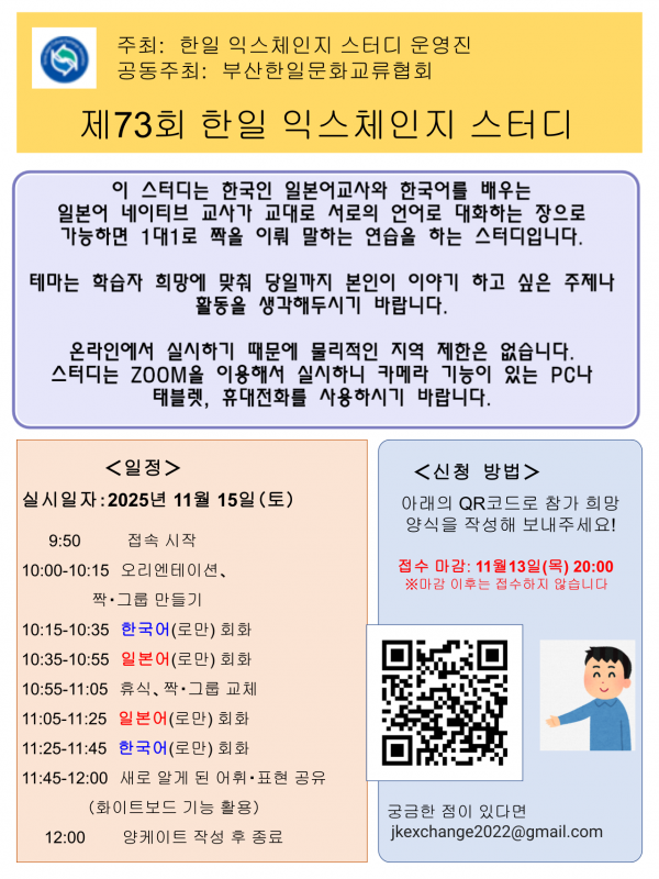 우리 협회와 한일익스체인지스터디 운영그룹이 공동으로 주최하는 한일 익스체인지 스터디(제73회)가 아래와 같이 개최됩니다.